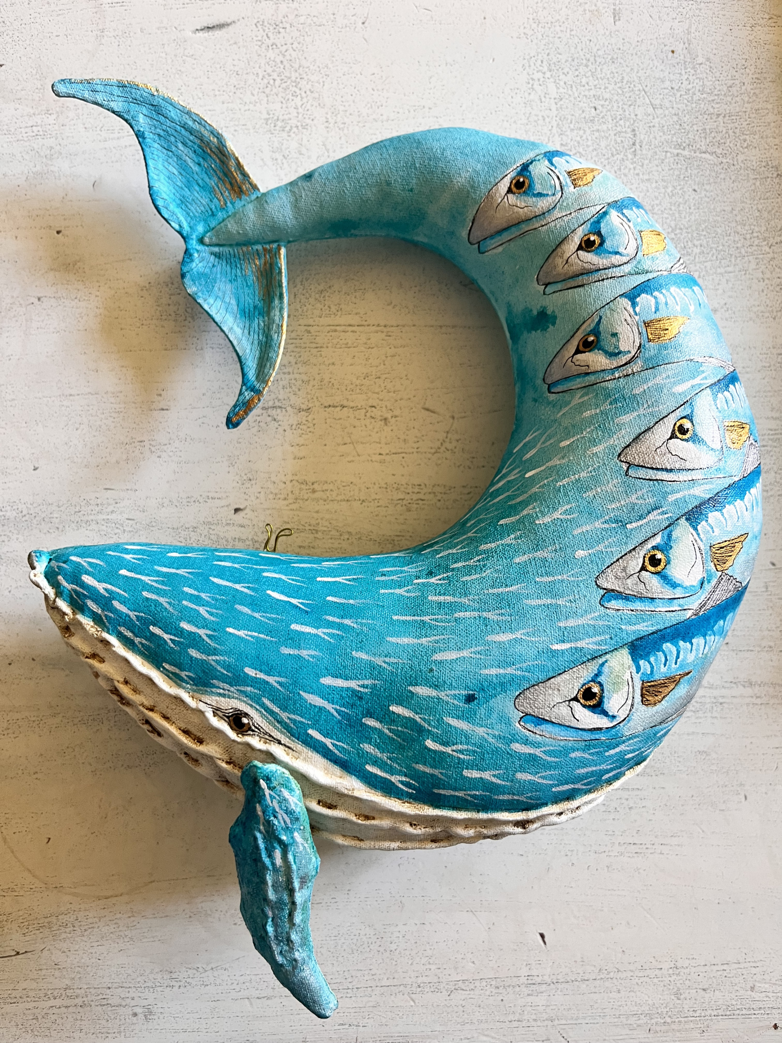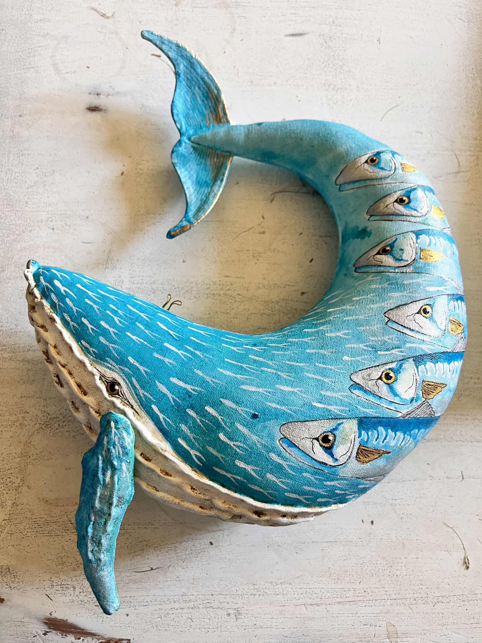 When you paint from you heart and soul something magical happens, and this is it. My latest whale, inspired by the ocean and one of my favourite fish the mackerel. Made in calico and firmly stuffed, then painted in professional acrylics.