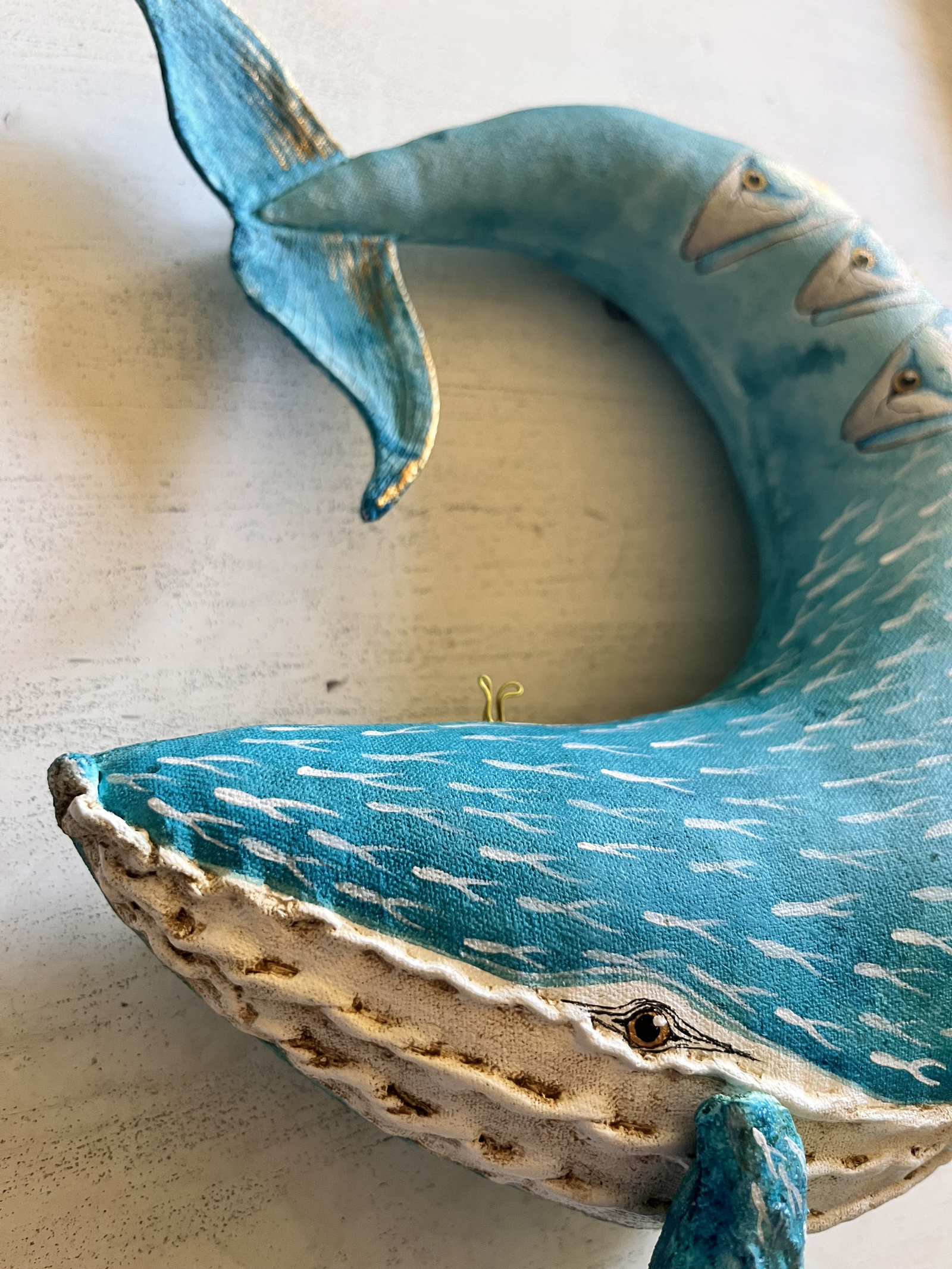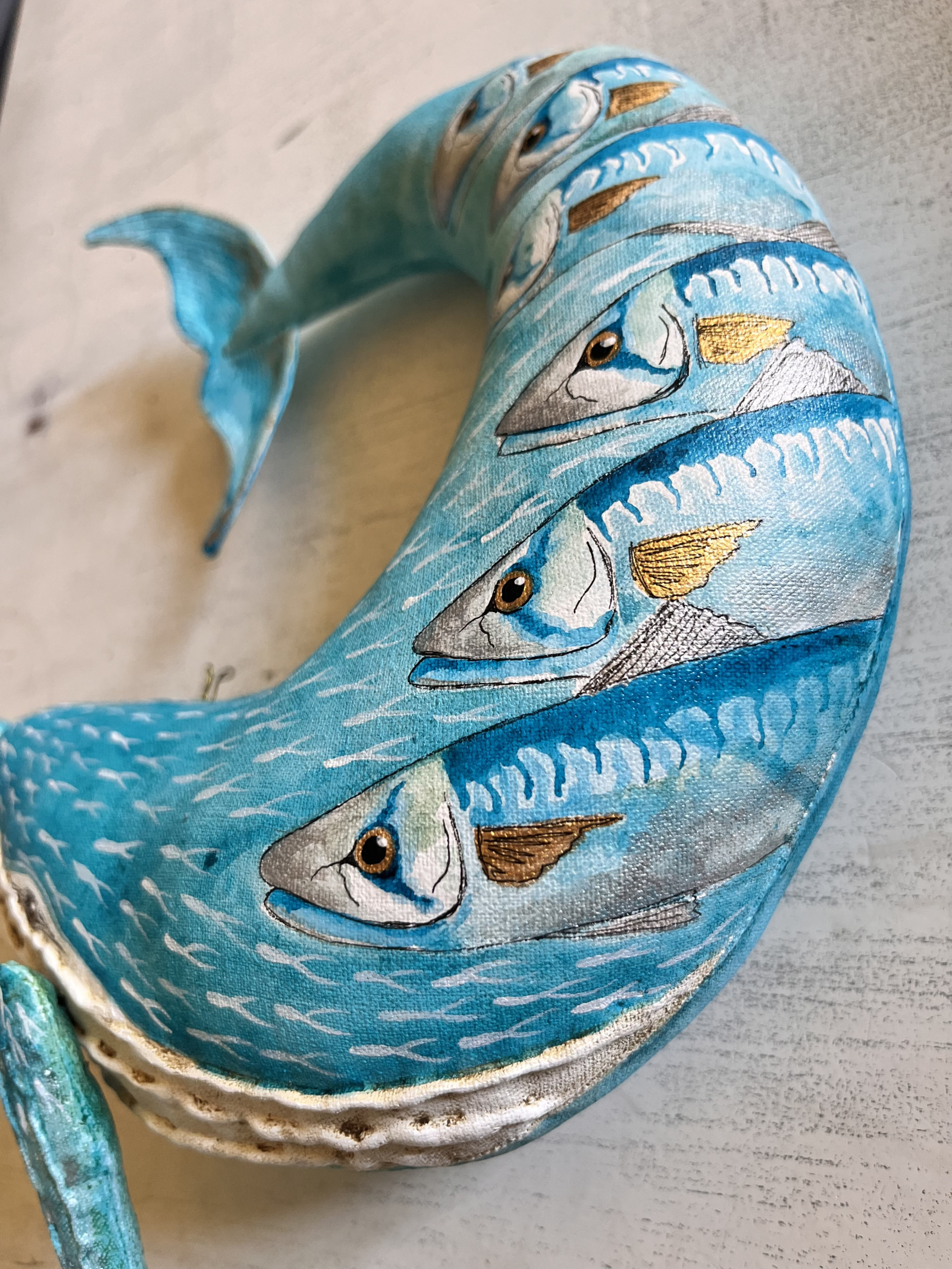 Quand on peint avec son cœur et son âme, quelque chose de magique se produit, et c'est exactement ce qui s'est passé ici. Ma dernière baleine, inspirée par l'océan et l'un de mes poissons préférés, le maquereau. Réalisée en calicot et bien rembourrée, puis peinte à l'acrylique de qualité professionnelle.