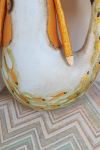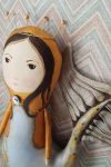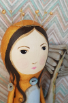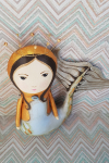 A gorgeous mermaid art doll with a golden jacket. A golden crown with glass beads and handpainted golden fish swimming across her tail. She is a tall 21cm by 20cm across and 5cm deep. She is made from calico and firmly stuffed primed and sanded twice then painted in professional acrylics, she is then waxed to give an antique leather look and feel.