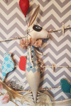 A gorgeous harlequin inspired Merhare (a whimsical mermaid/hare). I just loved painting this fellow and he turned out just perfect. He is painted in acrylics and his body is a pearlesant white/gold very chic. He has an antique lace ruffle at his neck . He measures a tall 40cm by 12cm across (tail width). Parts of his jacket and tail are antiqued with wax to give an aged look and feel.