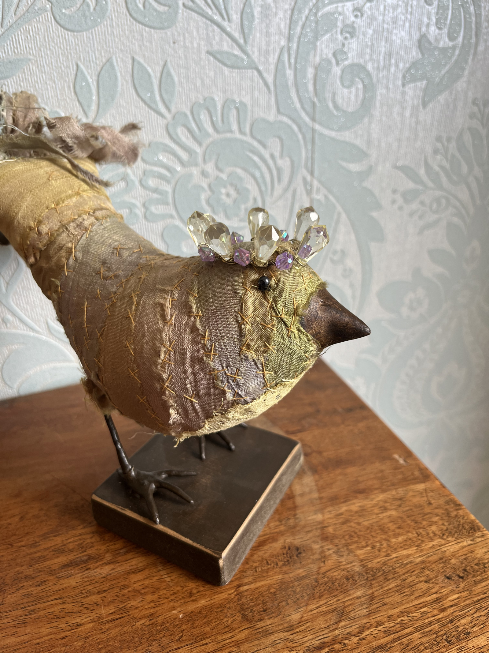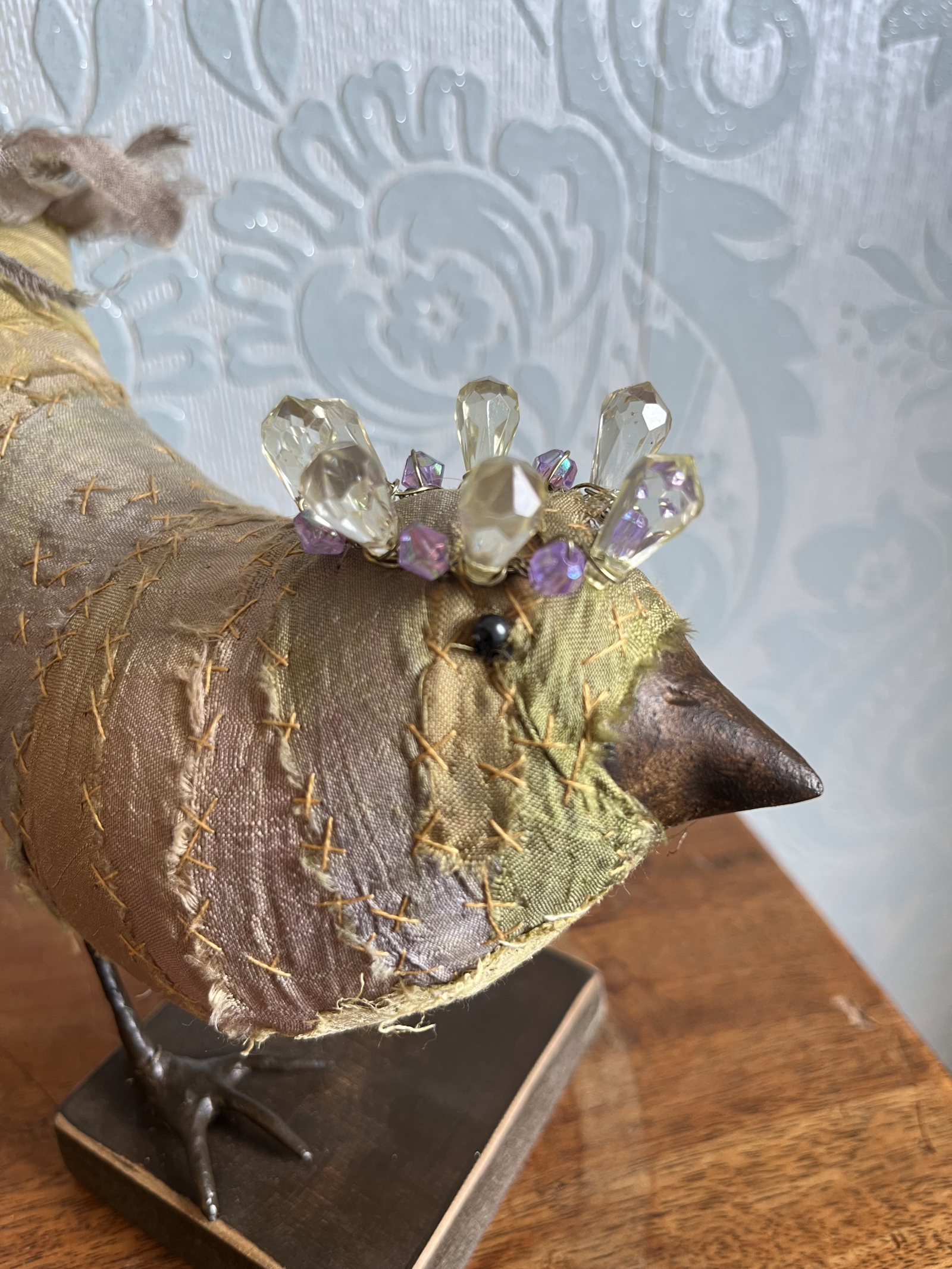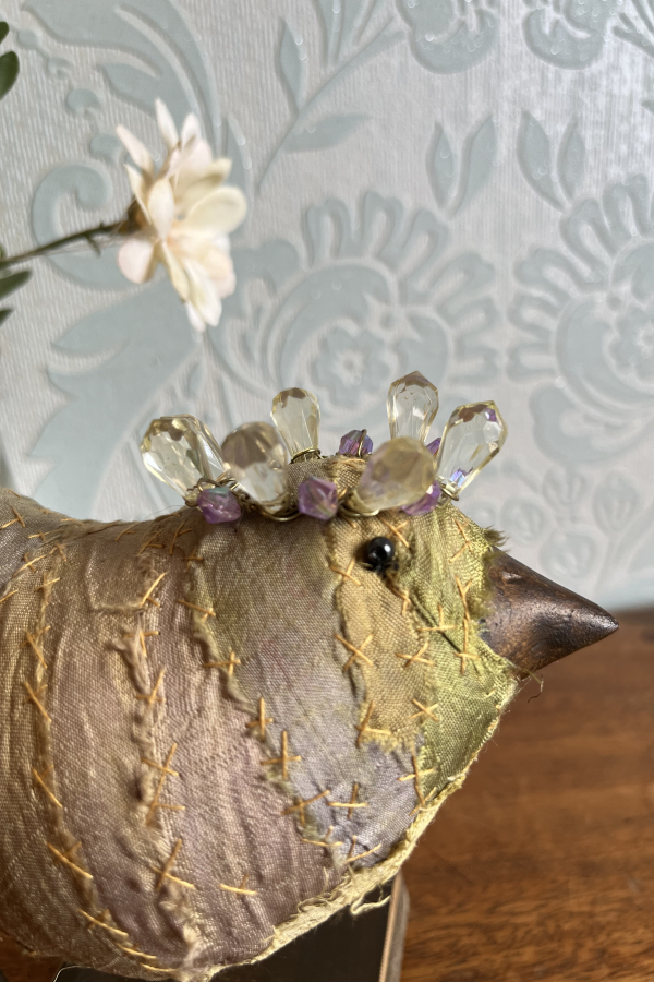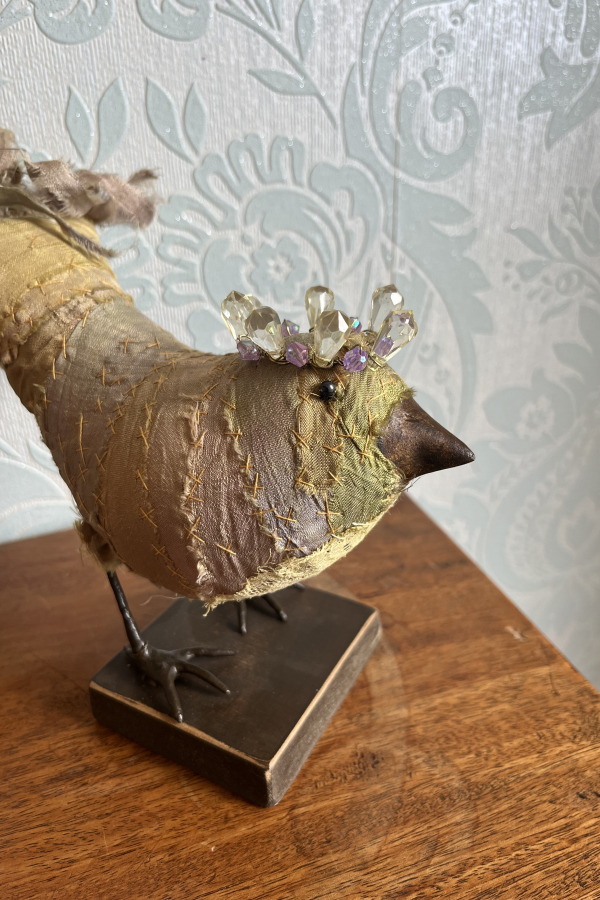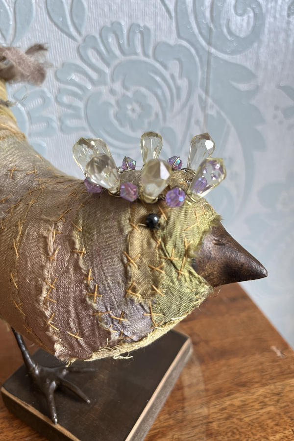 Each bird wears a small glimmering crown, delicately wired and catching the light like a secret. Their fabric bodies are plump and softly frayed at the edges, celebrating the beauty of wear, and time touch while the solid beak and slender metal legs give them a quiet strength and presence.
