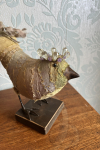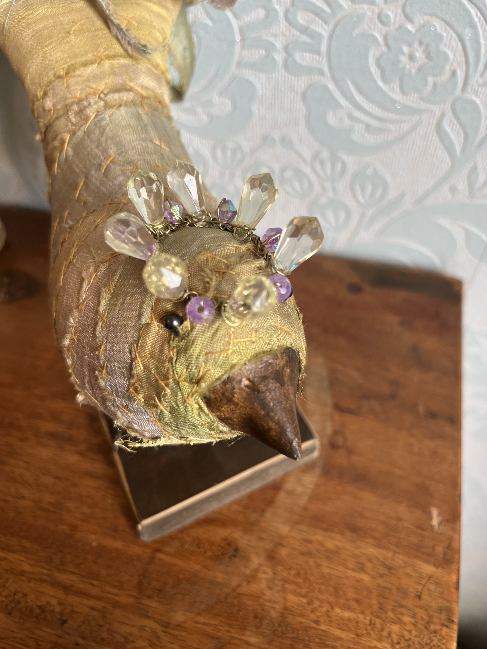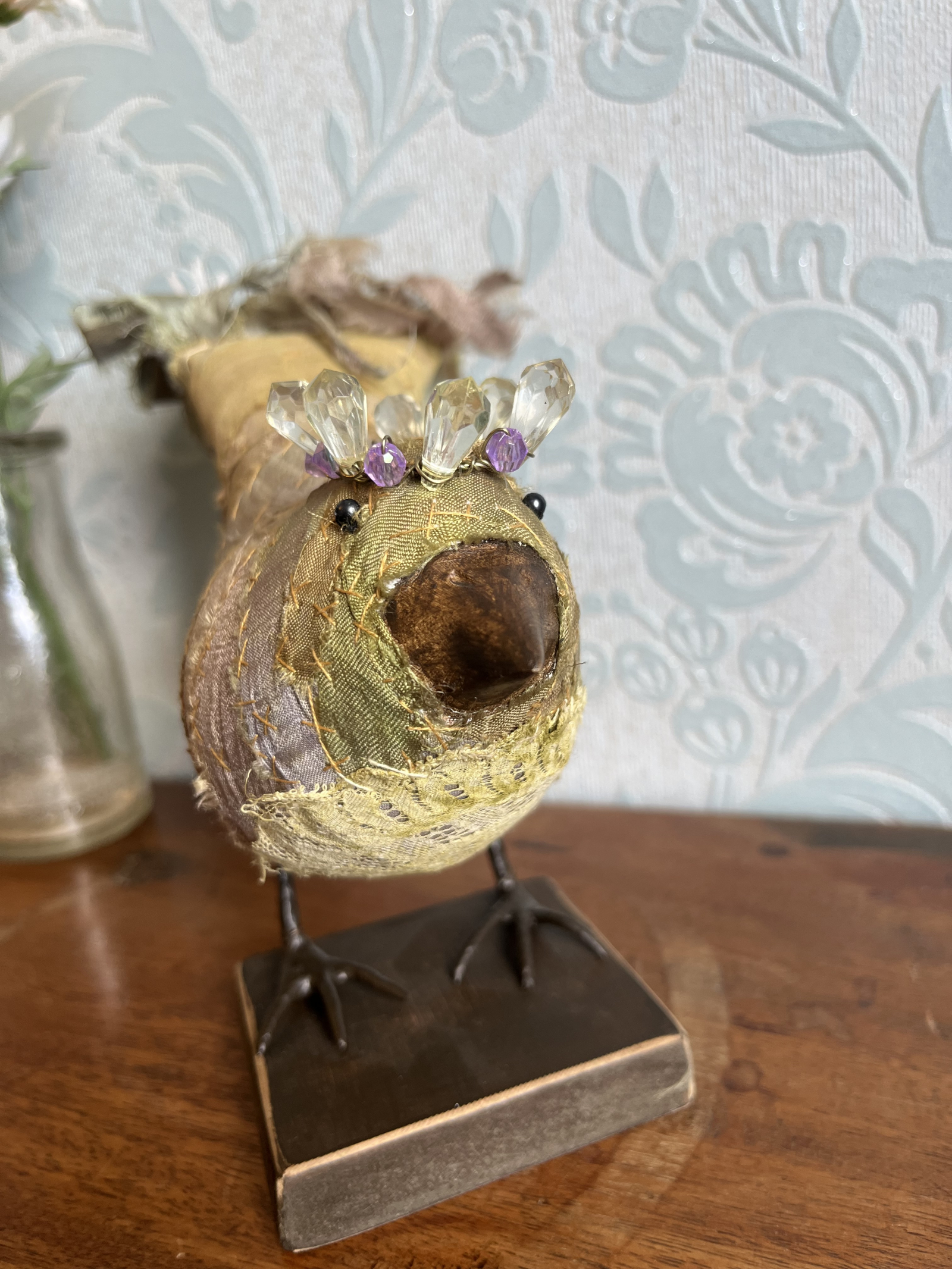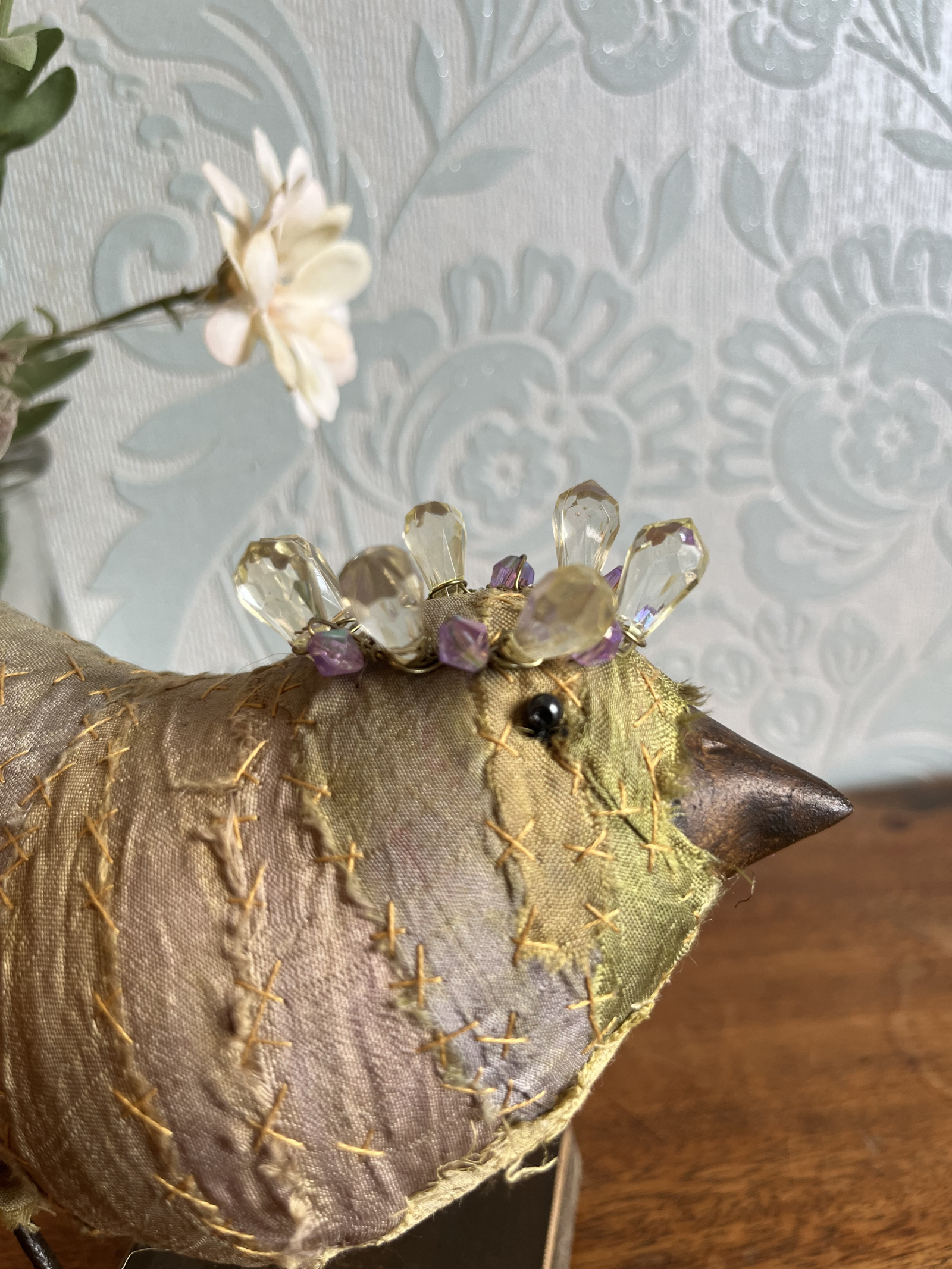 Each bird wears a small glimmering crown, delicately wired and catching the light like a secret. Their fabric bodies are plump and softly frayed at the edges, celebrating the beauty of wear, and time touch while the solid beak and slender metal legs give them a quiet strength and presence.