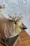 Chaque oiseau porte une petite couronne scintillante, délicatement câblée et captant la lumière comme un secret. Leur corps en tissu est prune et légèrement effiloché sur les bords, célébrant la beauté de l'usure et du temps qui passe, tandis que leur bec solide et leurs pattes métalliques élancées leur confèrent une force et une présence discrètes.