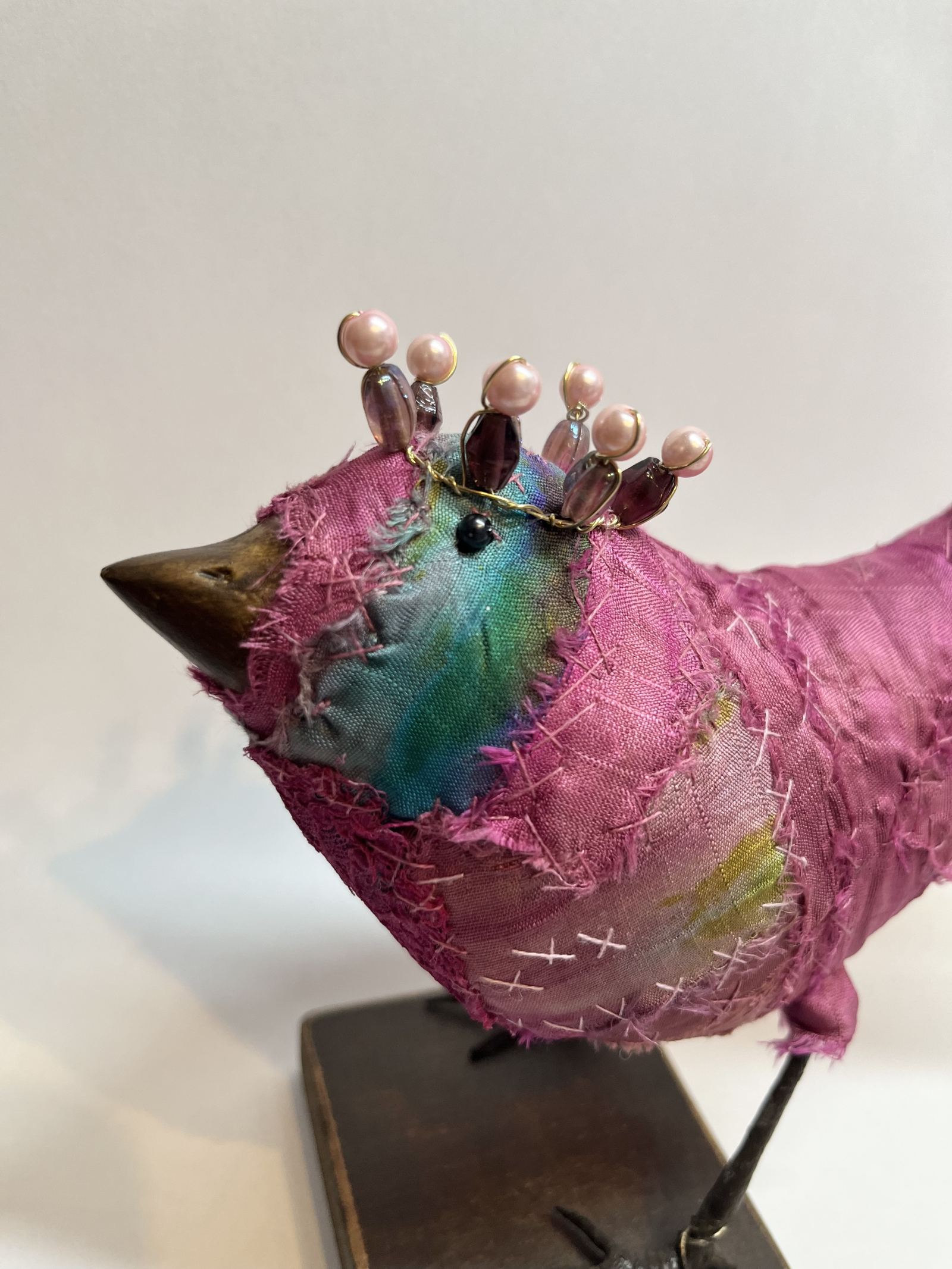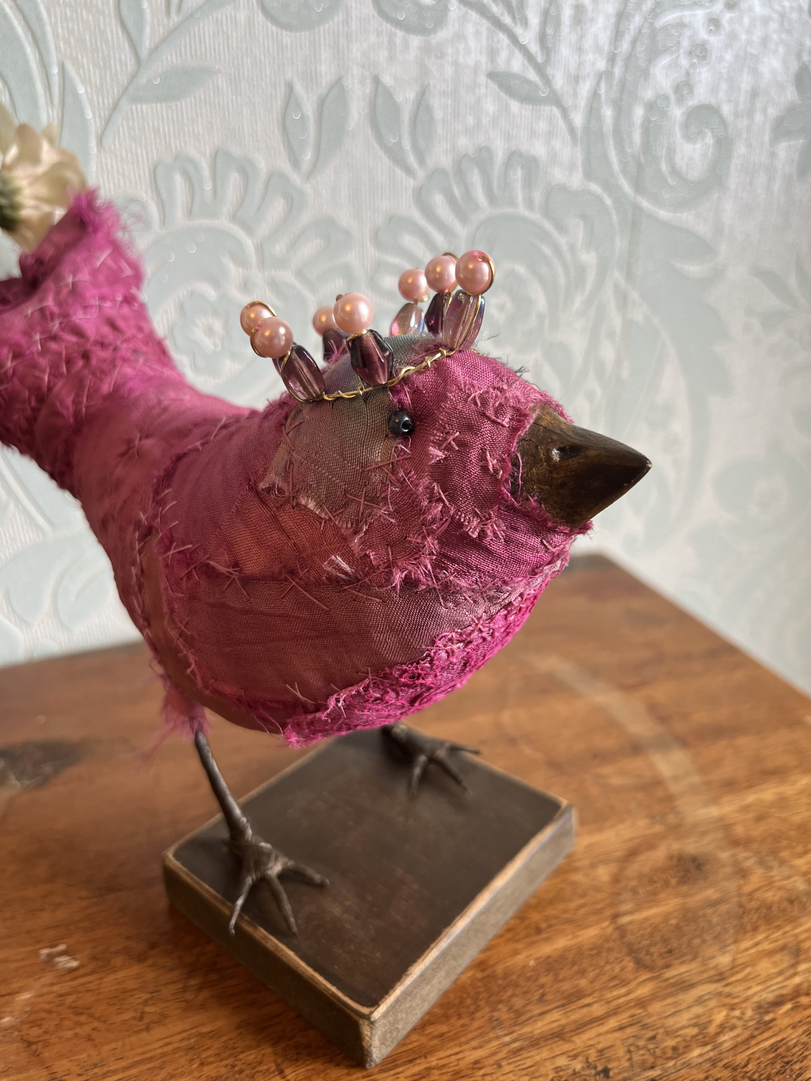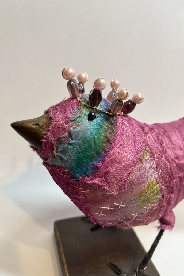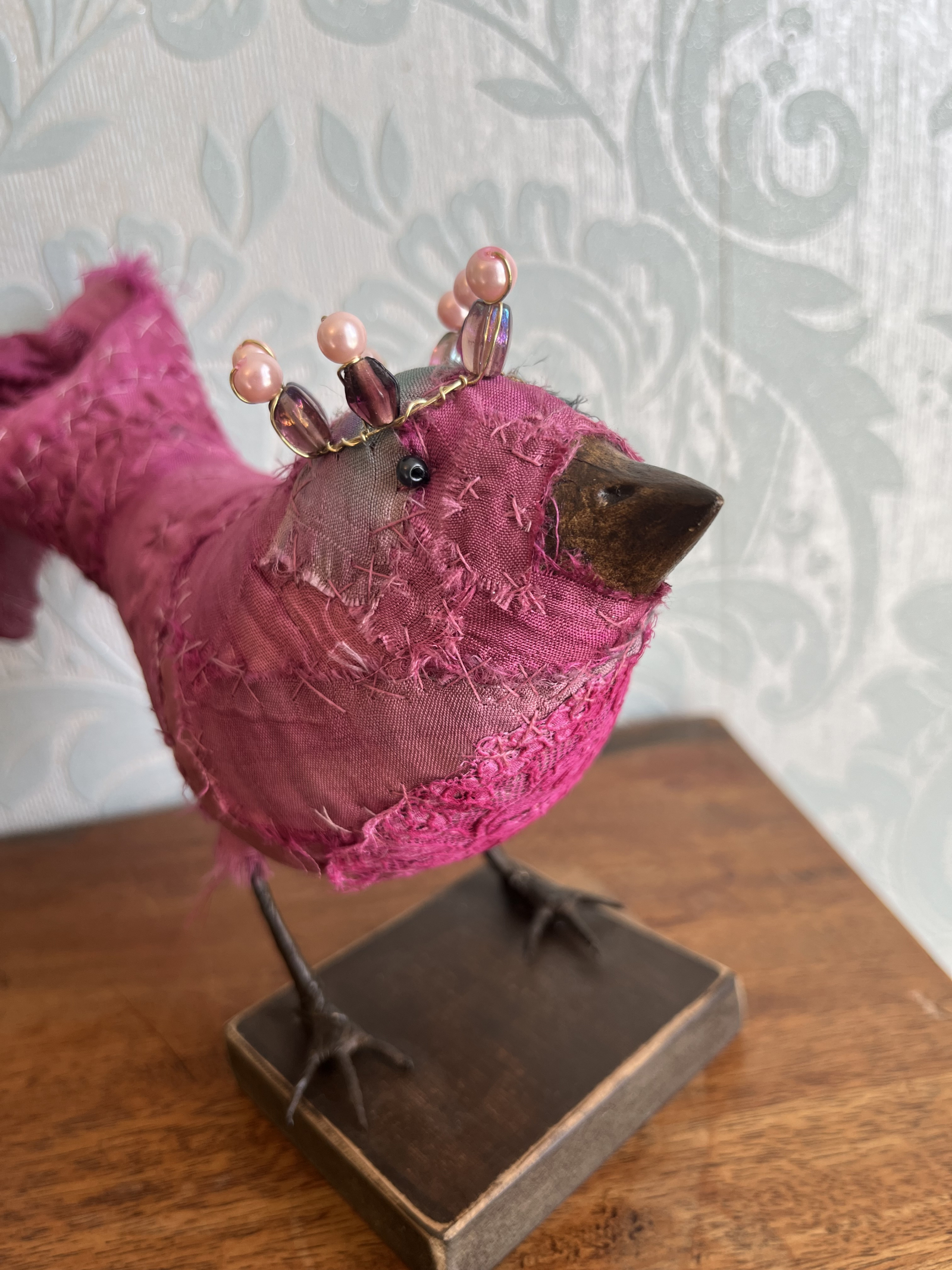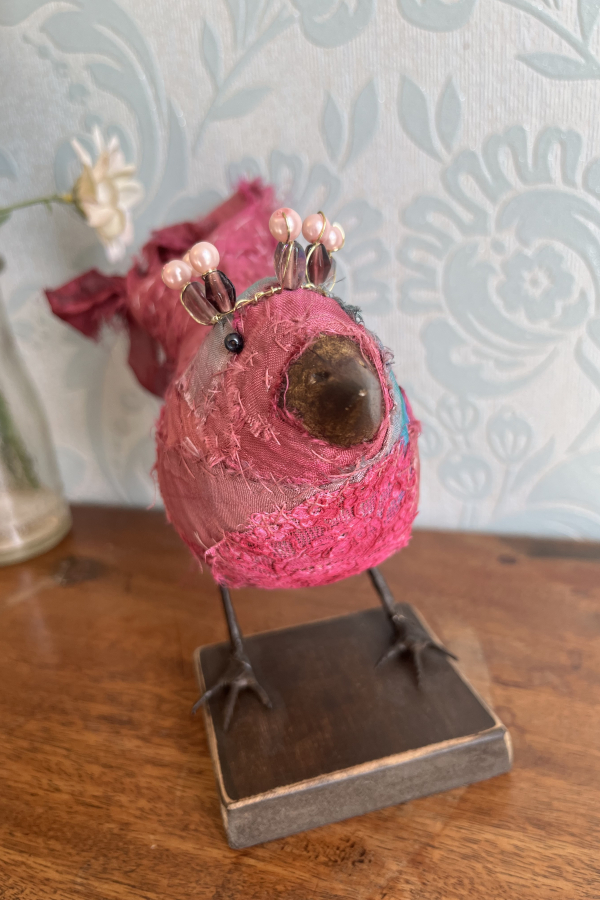 Each bird wears a small glimmering crown, delicately wired and catching the light like a secret. Their fabric bodies are plump and softly frayed at the edges, celebrating the beauty of wear, and time touch while the solid beak and slender metal legs give them a quiet strength and presence.