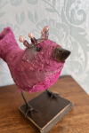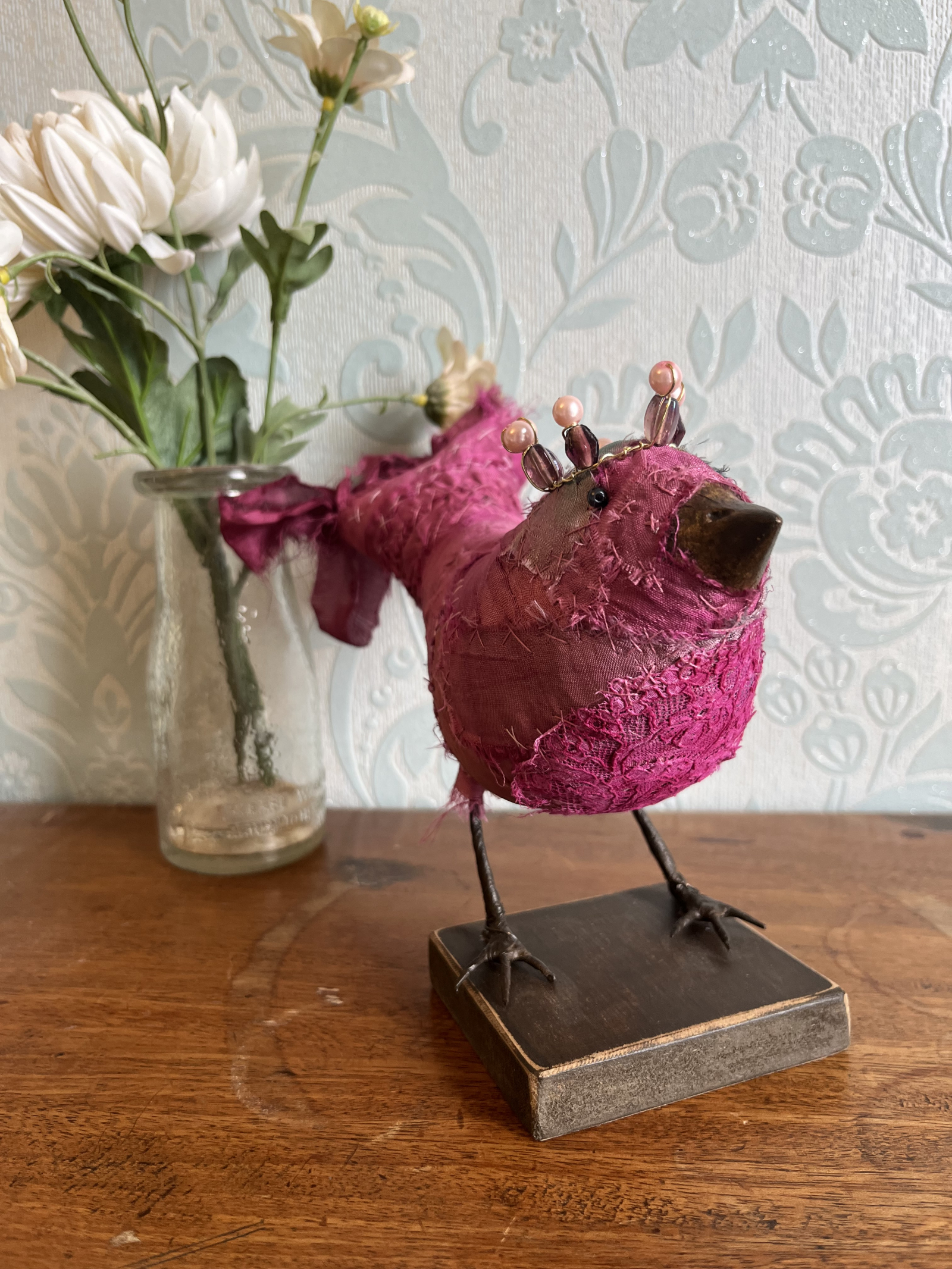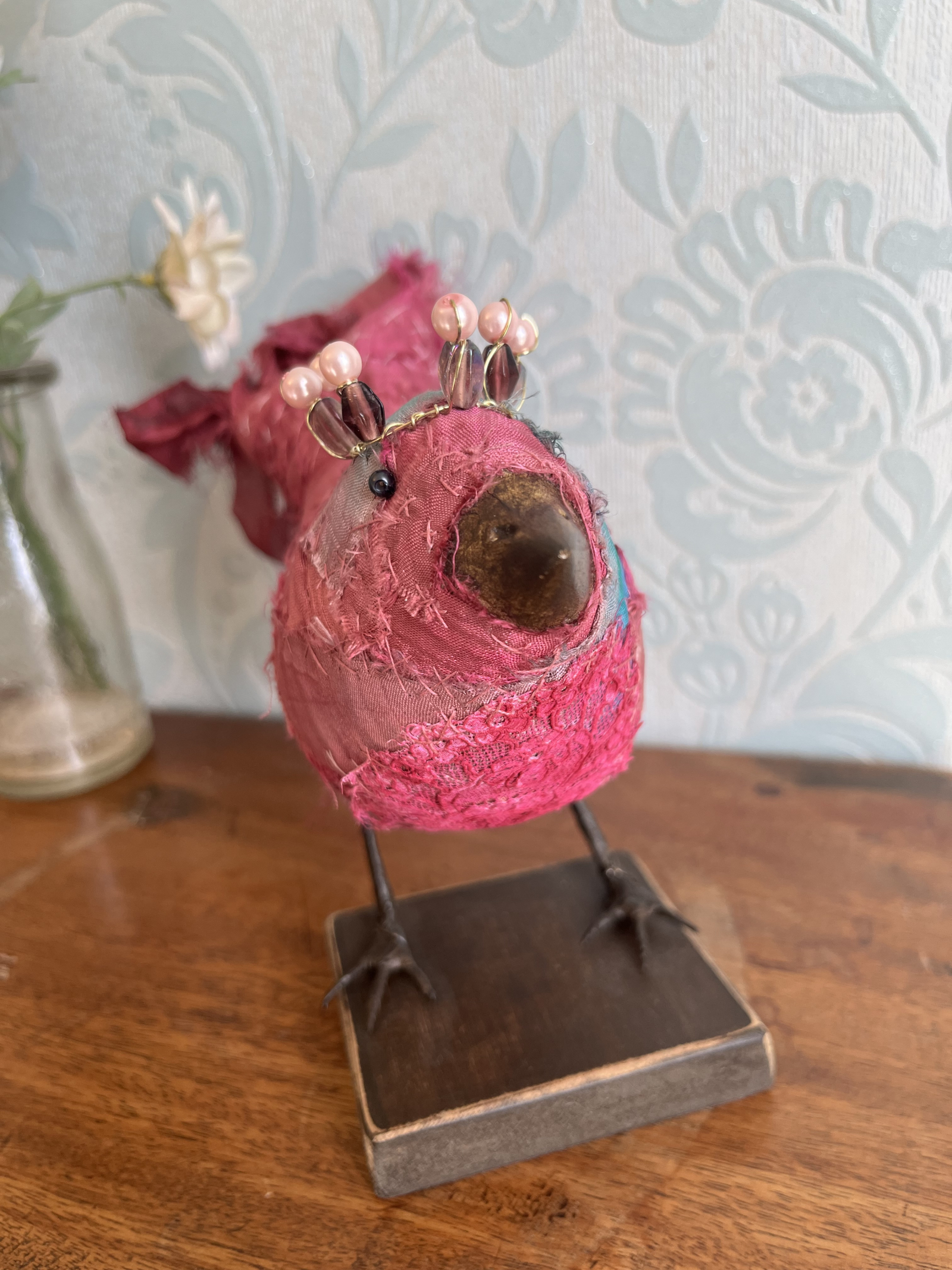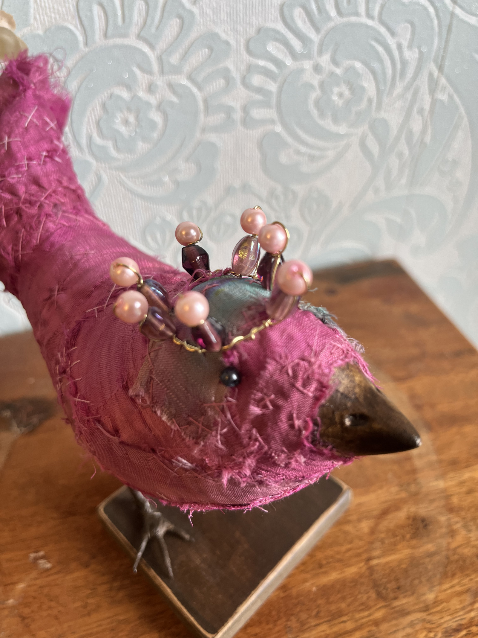 Each bird wears a small glimmering crown, delicately wired and catching the light like a secret. Their fabric bodies are plump and softly frayed at the edges, celebrating the beauty of wear, and time touch while the solid beak and slender metal legs give them a quiet strength and presence.