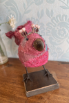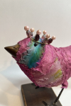 Matériaux utilisés : ruban sari, dentelle, pattes en fil de fer, bec en argile séchée à l'air, perles, peinture acrylique.