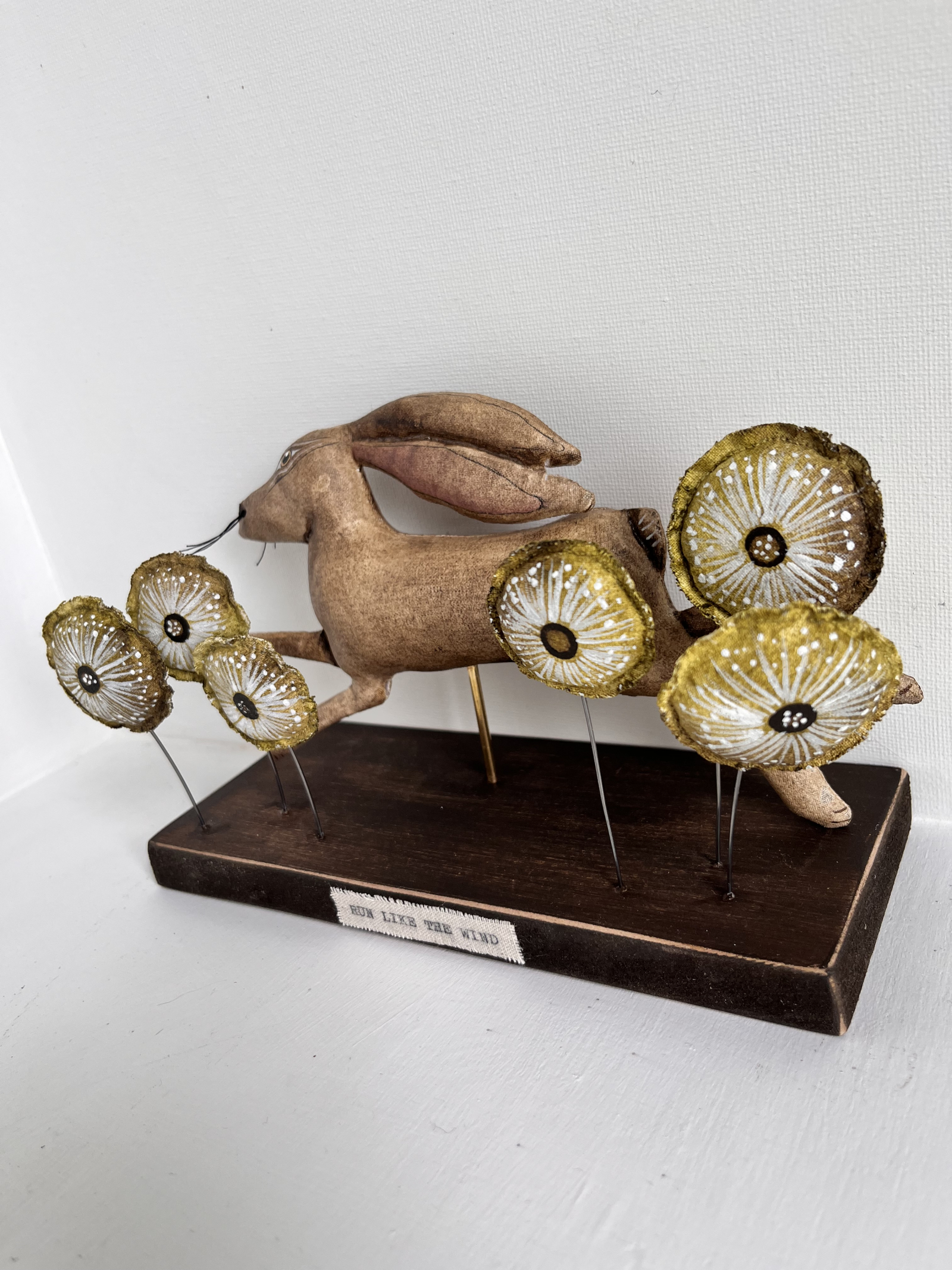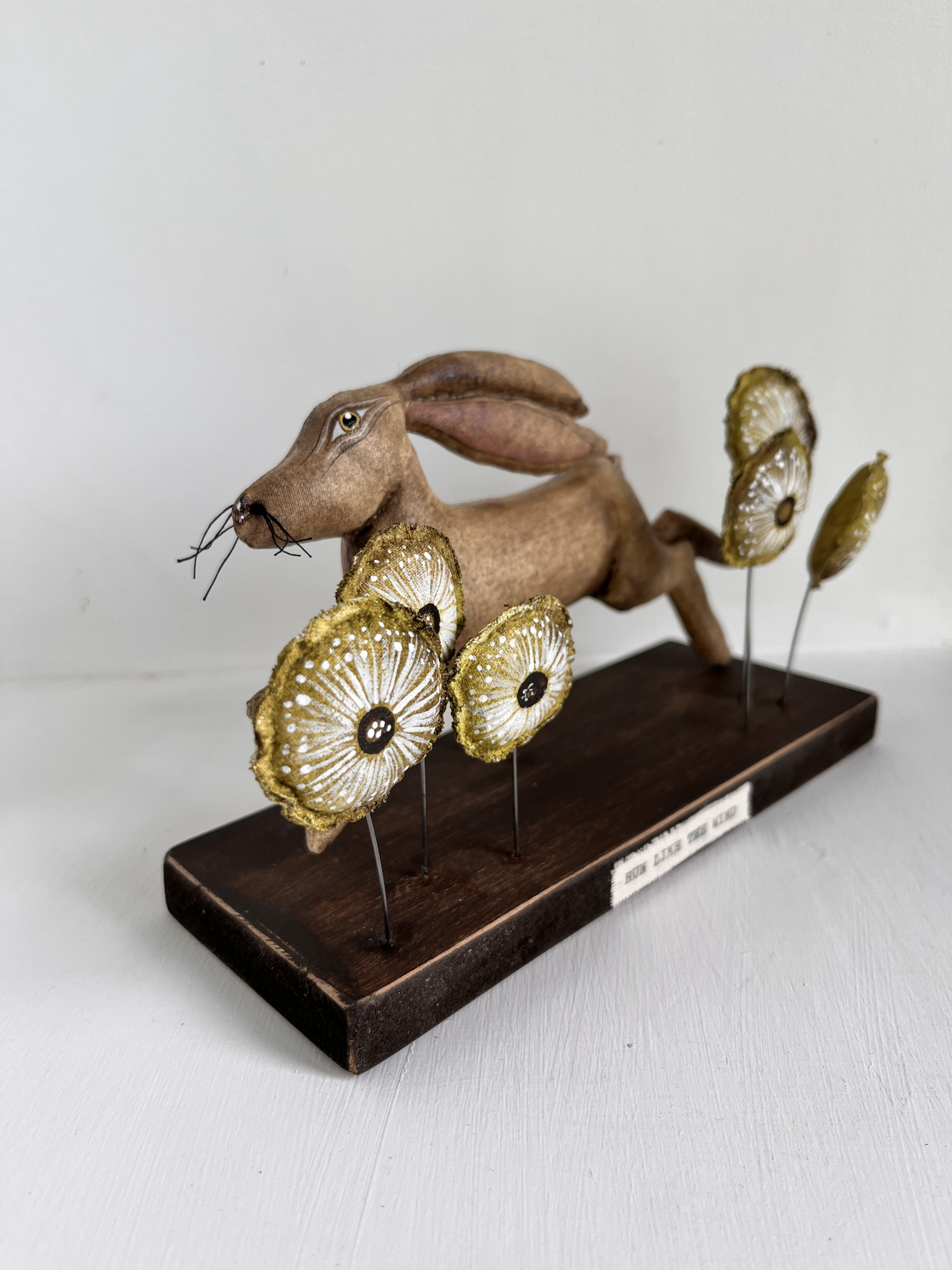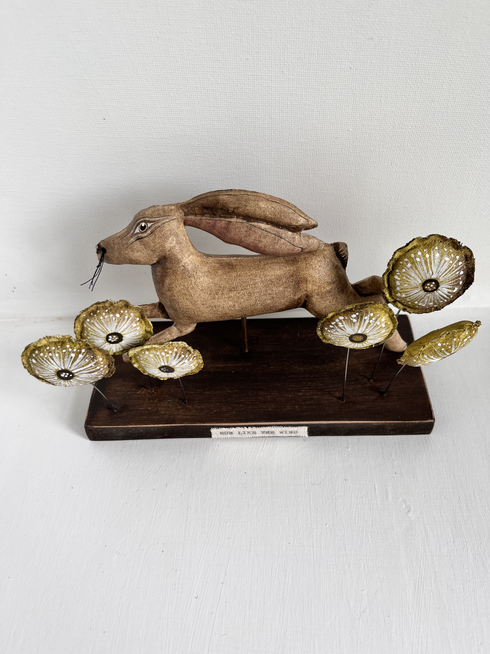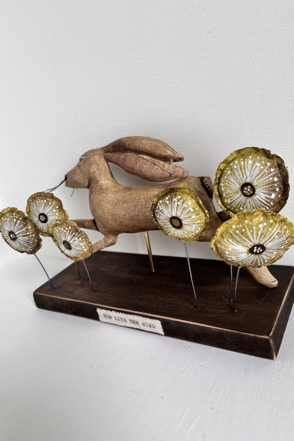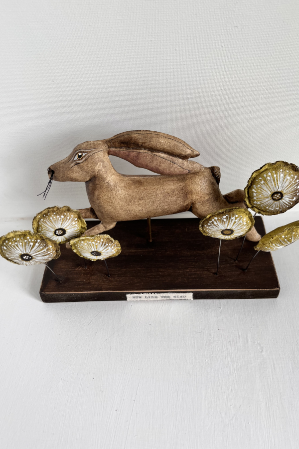 The one of a kind hare sculpture seems to have lept straight out of a storybook-long-eared, bright-sirited, and racing through a field of imagined blooms. It's delicate calico form has been shaped by hand and then lovingly painted to bring out soft contours and quiet expression. The flowers-suspended on fine piano wire stems. There is a sense that if you look away for a moment he may carry on running...somewhere just beyond reach.