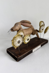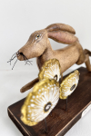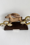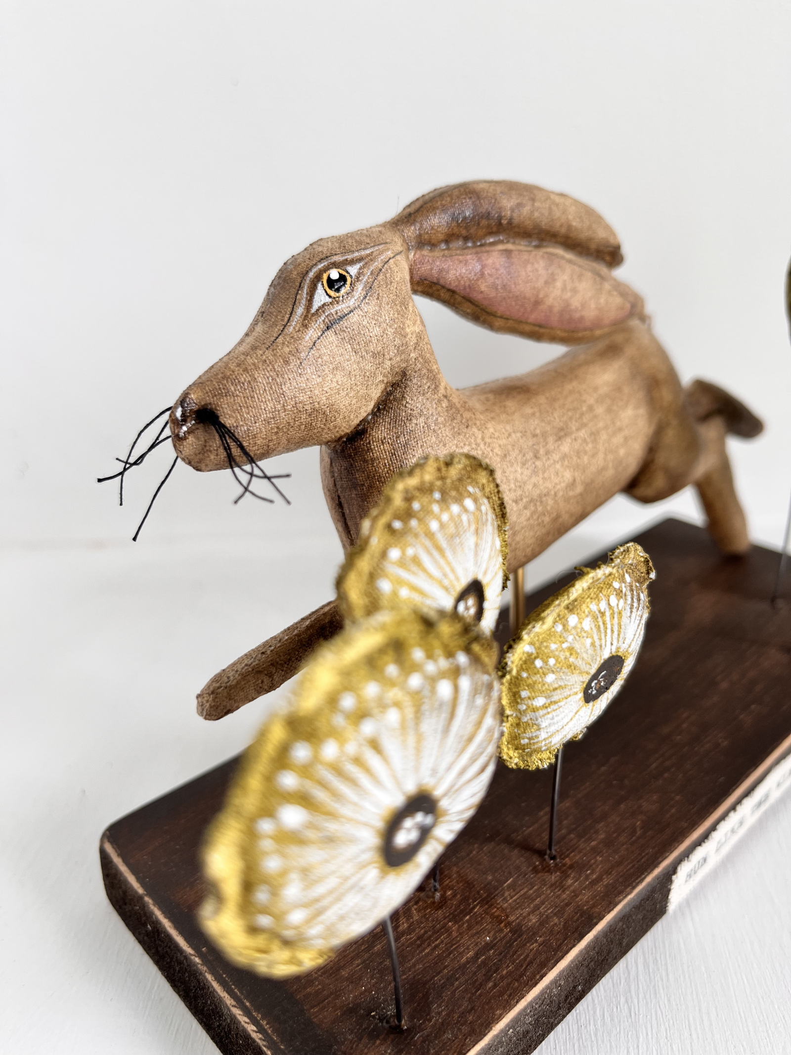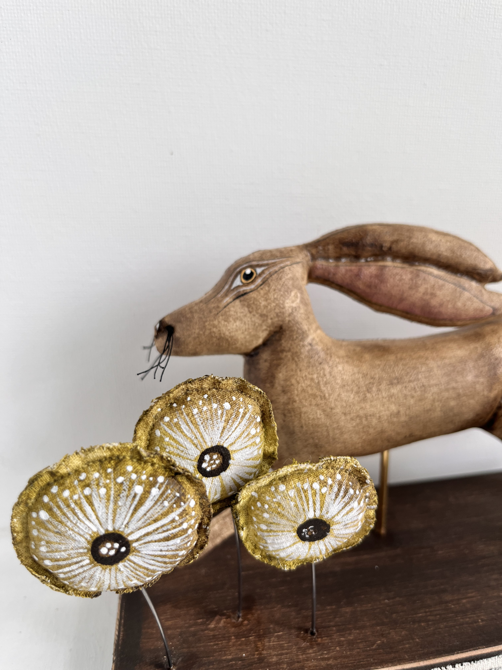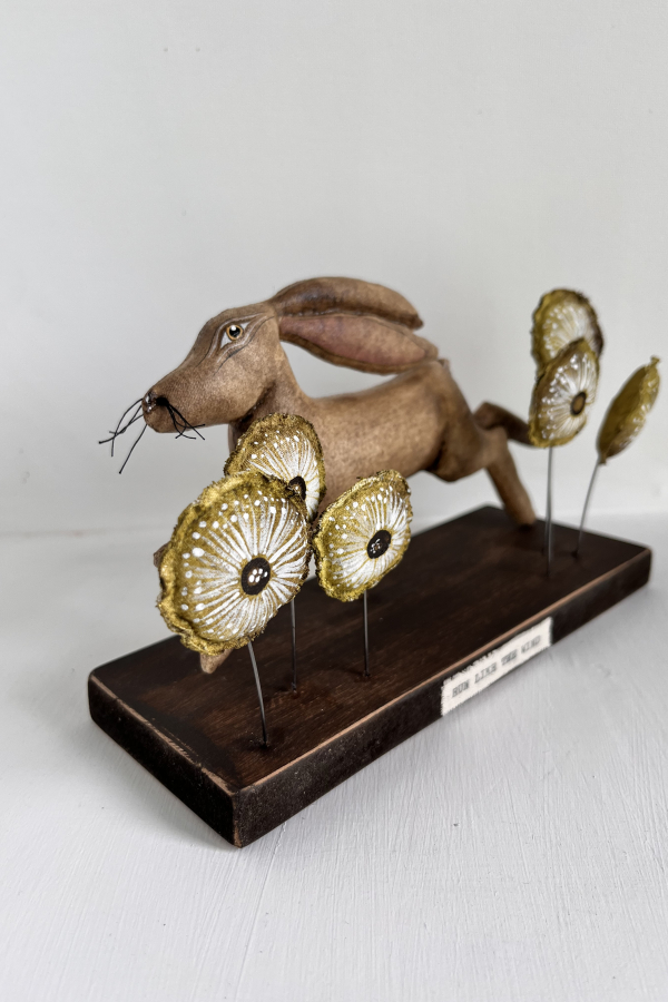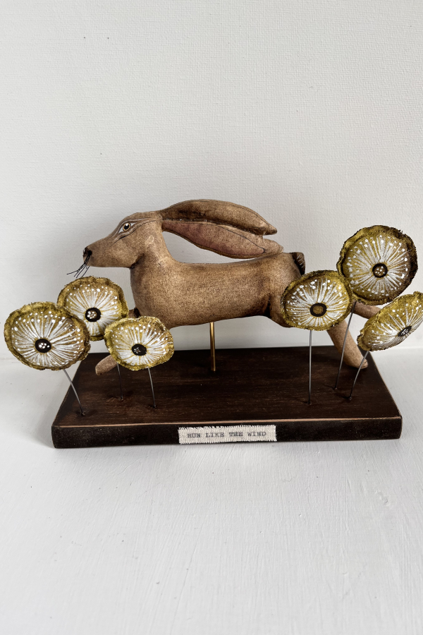 The one of a kind hare sculpture seems to have lept straight out of a storybook-long-eared, bright-sirited, and racing through a field of imagined blooms. It's delicate calico form has been shaped by hand and then lovingly painted to bring out soft contours and quiet expression. The flowers-suspended on fine piano wire stems. There is a sense that if you look away for a moment he may carry on running...somewhere just beyond reach.