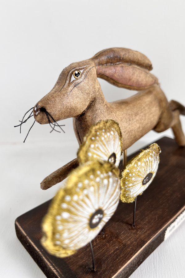 Cette sculpture unique de lièvre semble tout droit sortie d'un livre d'histoires — longues oreilles, esprit vif et courant à travers un champ de fleurs imaginaires. Sa délicate forme calicot a été façonnée à la main puis peinte avec soin pour faire ressortir ses contours doux et son expression paisible. Les fleurs sont suspendues sur de fins tiges en fil de piano. On a l'impression que si vous détournez le regard un instant, il pourrait continuer de courir... quelque part juste hors de portée.