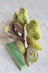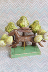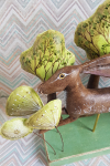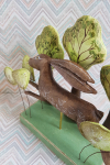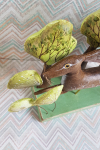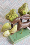 So here he is, he is hand painted on calico with acrylics and then varnished. He is mounted on a mdf block ( I use mdf due to international shipping constraints on wood) and he has a brass rod to keep him in place. The trees and flowers are all anchored with wire.