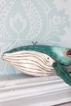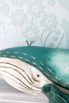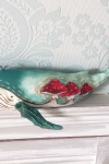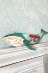 Une nouvelle baleine d'inspiration folklorique a été ajoutée à la collection. Elle est d'une magnifique couleur sarcelle, mélangée à la main et donc totalement unique. Il est fait en calicot et sa mâchoire est en argile séchée à l'air avec quelques barnicles ajoutés. Il a de magnifiques champignons agricoles rouges peints sur son flanc et une série de poissons nageant sur son corps.